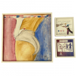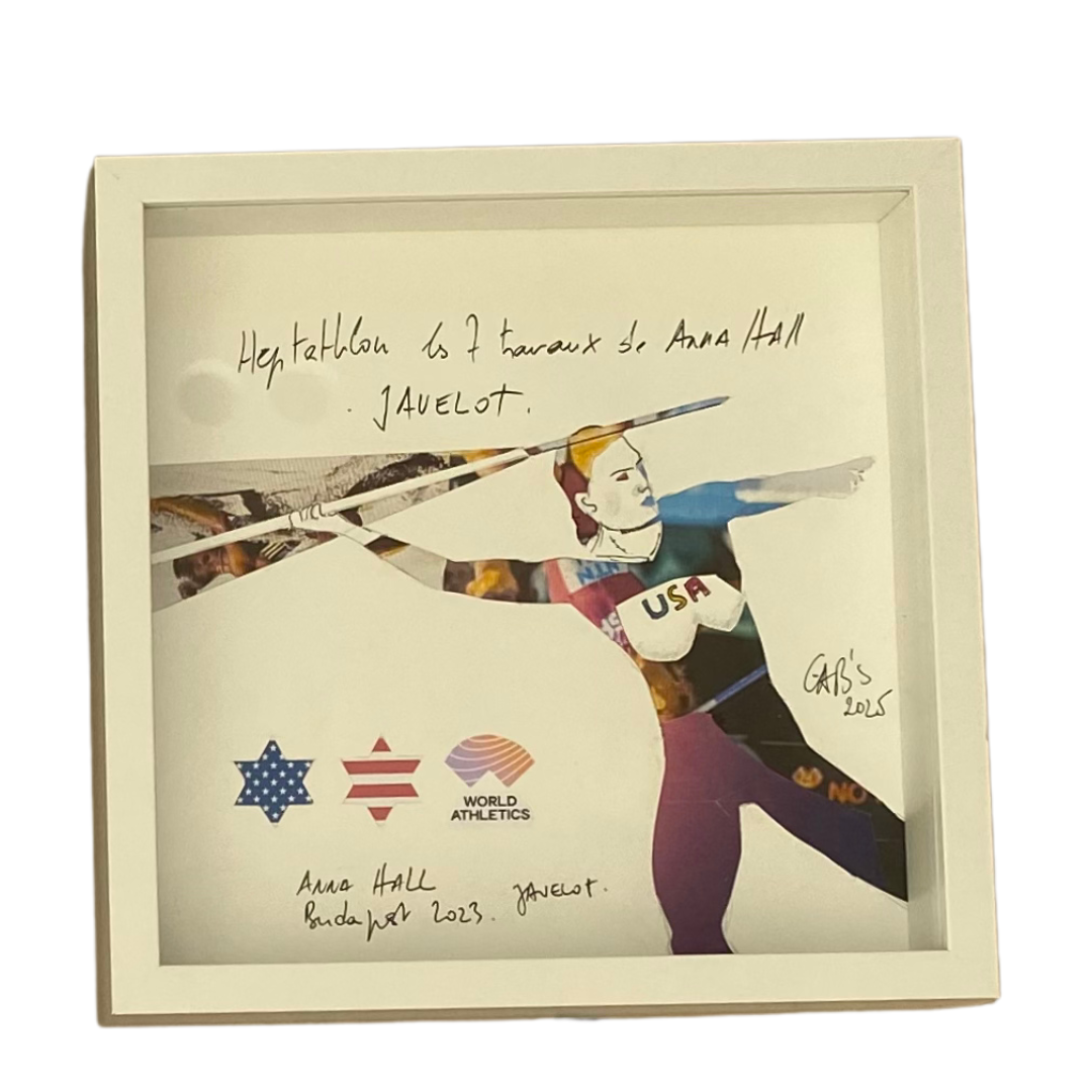 Cette toile » ongle rouge » accompagnée de deux tableaux (pochoirs) inspirés des exploits de ANNA HALL, sportive Américaine dont la présence sur les stades magnifie sa discipline : l’Heptathlon. Quand on la regarde, chaque geste technique, chaque position statique nous offrent la panoplie complète d’un corps parfait sculpté pour gagner !